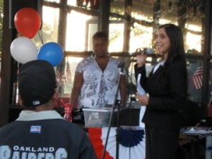 San Leandro mayoral candidate Sara Mestas speaks to her supporters Friday in front of Loard’s Ice Cream in The Greenhouse. She emphasized city government helping people is not “socialism” as some conservatives have intimated and criticized city employees making over $200,000-a-year–a pointed reference to City Manager Stephen Hollister. Mestas told supporters who received a free scoop of ice cream, she believes the city needs to create incentives for new businesses and new home ownership.