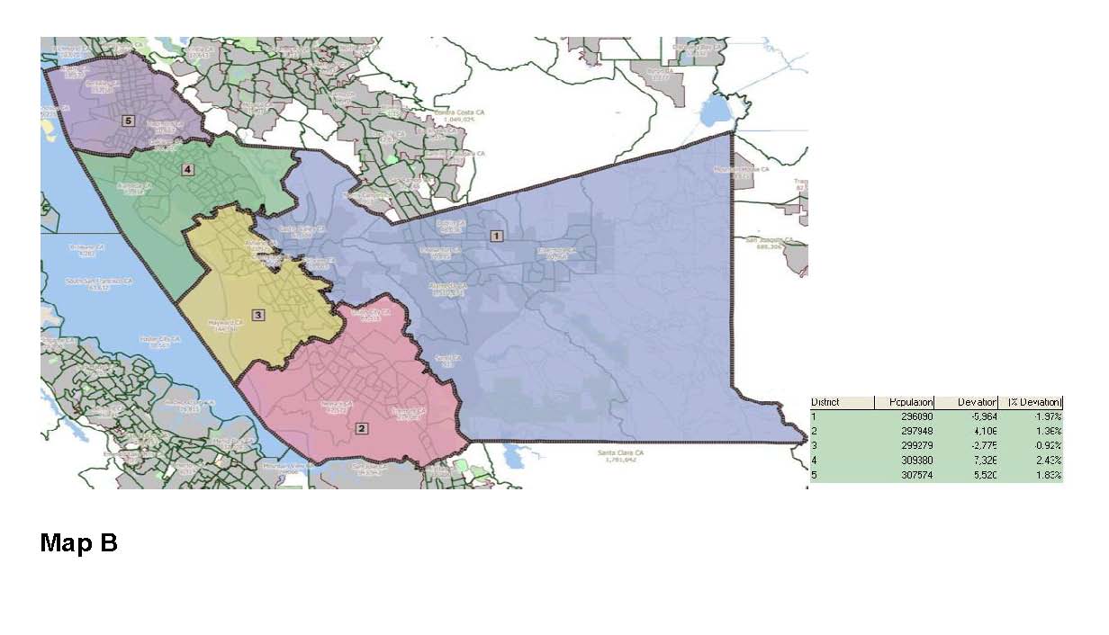 The likelihood of Map B gaining any foothold does not appear likely. In the PowerPoint presentation for the series of six redistricting meetings in the next 10 days starting today in Dublin, there is no mention of the more radical proposal. The county’s new district boundaries could be approved by the Board of Supervisors as early as the July 12 meeting and finalized two weeks later.