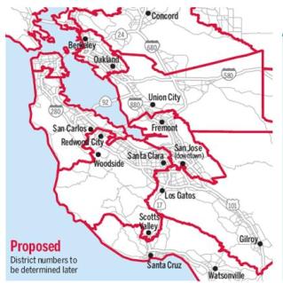The district would stay true to Alameda County’s east boundaries and swallow the Tri-Valley area, Hayward, San Leandro and parts of Fremont.