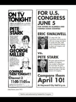 April 10, 2012 | Dublin Councilman Eric Swalwell is getting major points for recreating a 1972 advertisement for a short five-minute debate between Stark and then-Rep. George P. Miller aired on Channel 2. It’s not the crack campaign research find some are making it out to be. The similarities between a young Stark challenging Miller in the Democratic primary and Swalwell, 31, today taking on 80-year-old Stark are too obvious, but a few weeks past the season premiere of “Mad Men” and a recent retro edition of Newsweek, the reconstituted ad hits a timely chord.