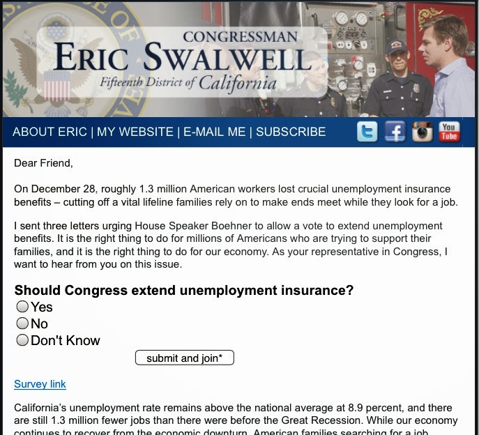 Congressman Swalwell supports extending unemployment insurance. Full stop. The above email serves a couple purposes: (1) allows him — and other members who sent out similar issue poll emails, such as Rep. George Miller on immigration reform — to tout broad district support for something they favor; and (2) measure how many people receiving the emails read them. That's it.