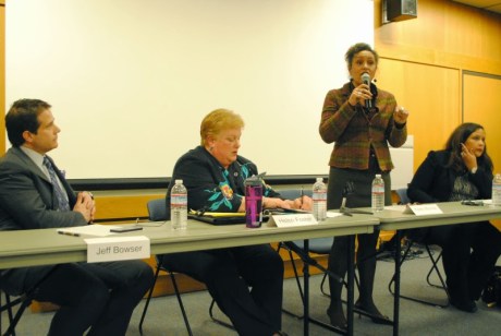 Candidates to replace retiring Alameda County Superintendent of Schools Sheila Jordan at a forum Wednesday in Hayward. Left to right, Jeff Bowser, Helen Foster, Karen Monroe and Ursula Reed. PHOTO/Steven Tavares