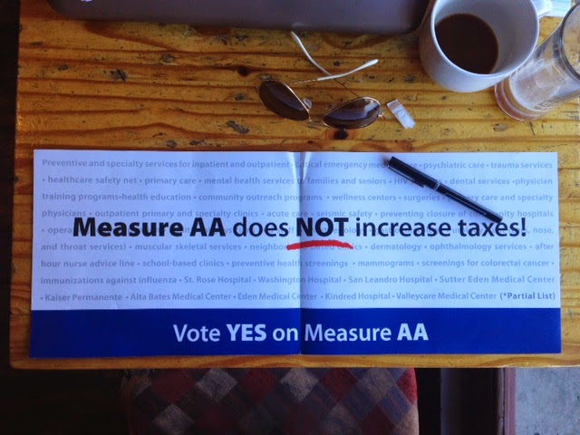 MEASURE AA Alameda County’s important renewal of the Measure A health care sales tax needs to garner two-thirds of the vote for passage. Over the years, the half-cent sales tax has helped prop up the county health care system during heady times, but it is due to sunset in 2019. Approving Measure AA would only extend the tax to 2034. Proponents of the measure want to make it clear this is not a new tax. Just to remind you, a new mailer sent to voters shouts in large type: “Measure AA does NOT increase taxes!”