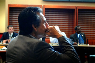 | Oakland Councilmember Noel Gallo listens to a public speaker at Friday’s Coliseum Joint Powers Authority meeting to approve a 10-year lease for the A’s. PHOTO/Steven Tavares |