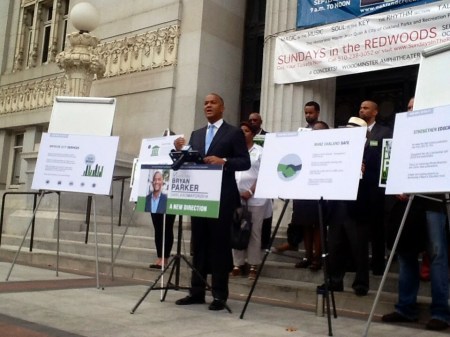 | Oakland mayoral candidate Bryan Parker detailing his plan for helping the city’s youth to succeed during a press conference last week in front of Oakland City Hall. PHOTO/Steven Tavares |