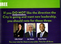In this mailer, however, which features a good bit of clunky grammar, the group says if you desire change at City Hall, you should vote–in no particular order–Schaaf, Tuman and Parker.