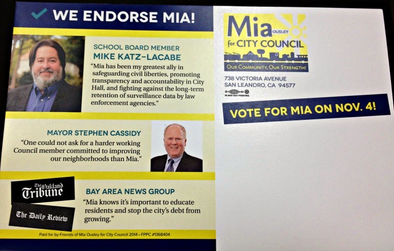 “Mia has been my greatest ally in safeguarding civil liberties, promoting transparency and accountability in City Hall, and fighting against the long-term retention of surveillance data by law enforcement agencies,” the mailer quotes Katz-Lacabe. Incidentally, each issues also represents Katz-Lacabe’s campaign platform.