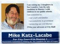Katz-Lacabe, meanwhile, has not raised enough money to even trigger a campaign finance disclosure report. But, that hasn’t stopped him from getting his name out through other means, like piggy-backing on the campaign flyers of a political ally in another council race.