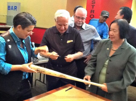 | Councilmember Rebecca Kaplan and Jean Quan with A’s co-owner Lew Wolff last summer. |