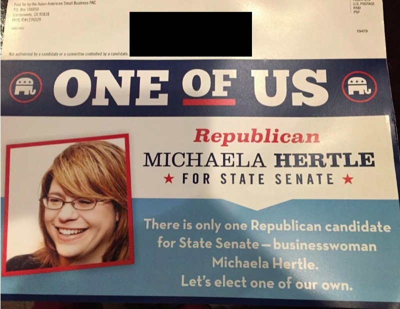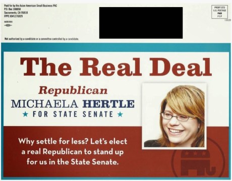 Alameda County Republican Michaela Hertle entered the state senate race in late January, but dropped out over a week later and endorsed centrist Democrat Steve Glazer. Nevertheless, mailers from the Asian American PAC were sent to voters last month clearly supporting Hertle.