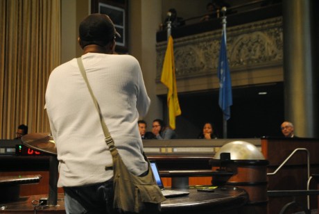 Oakland City Hall flamethrower Gene Hazard giving councilmember’s the business during a meeting last year.
