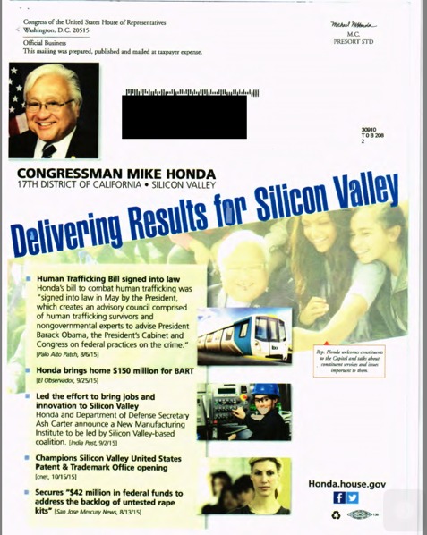 The mailer titled, “Delivering Results for Silicon Valley,” touts Honda’s involvement in bringing home federal funds for BART, his support for transgender equality and legislation for fighting human trafficking, among other accomplishments.