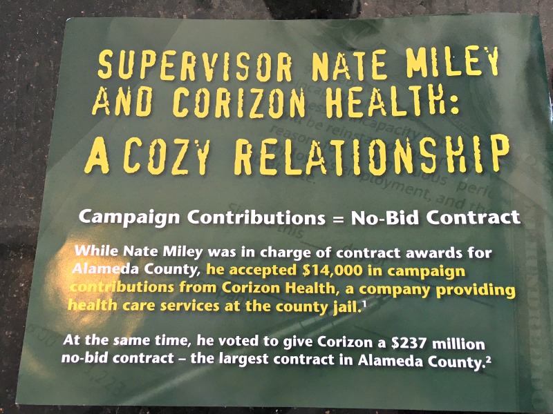 Among other talking points contained on the website and companion mailer sent to voters Friday is an instance when Miley supported a no-bid $237 million contract to the vendor providing health care services for county inmates while also receiving thousands in campaign donations.