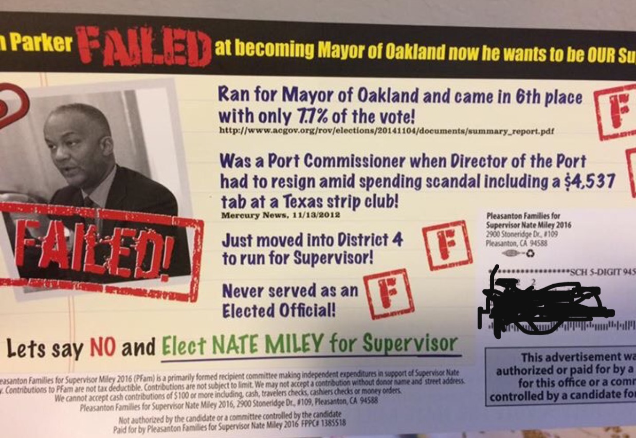 On the flip side, it declares Parker has failed as a candidate. Parker receives failing grades, according to the mailer, for finishing sixth in the 2014 Oakland mayoral race, never serving as an elected official and an allegation that he only recently moved to the district.