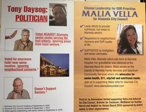 On the flip side, the IE highlights Daysog’s vote last month against a proposed Bay Farm senior center, while noting he supported a new hotel in the same area, closer to the Oakland Airport. The other half of the piece details the IEs support for City Council candidate Malia Vella.