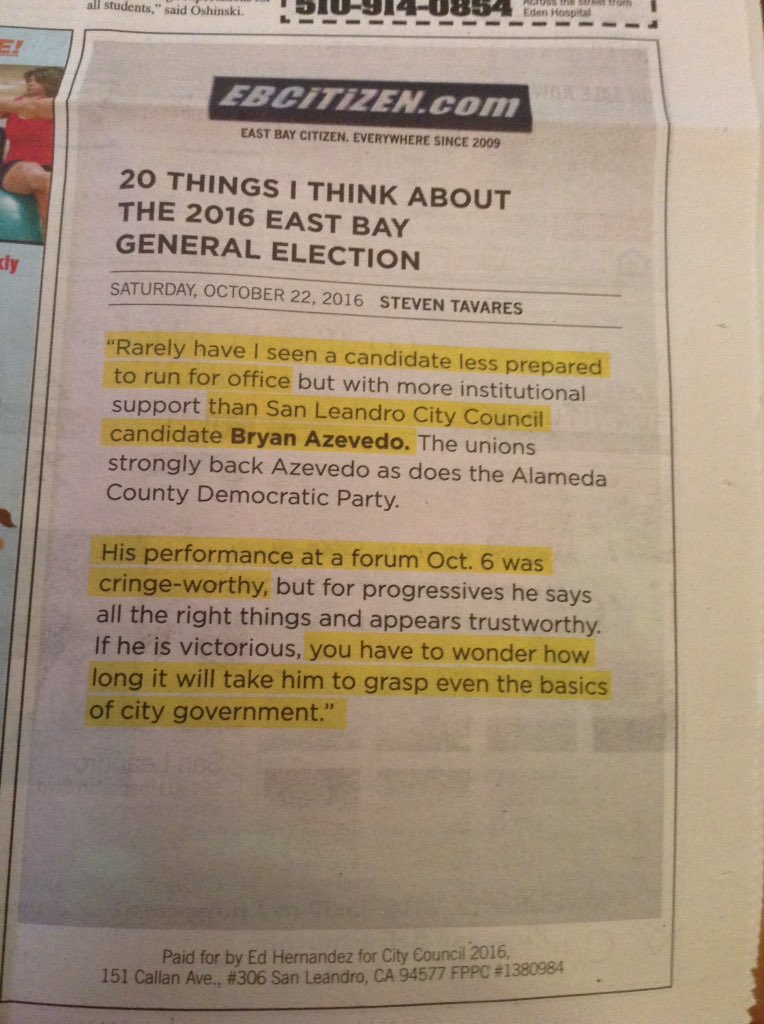 District 2 candidate Ed Hernandez did something that is verboten in San Leandro politics—he went negative in a newspaper ad that appeared in the San Leandro Times on Thursday. Hernandez, who is facing the union-backed Bryan Azevedo in the city’s only contested races on Nov. 8, used an East Bay Citizen opinion piece that deemed Azevedo unprepared for office as a means of skewering him. San Leandro has typically possessed an institutional abhorrence toward negative ads. However, the strategy may be a relic from the city’s old-guard politicos.