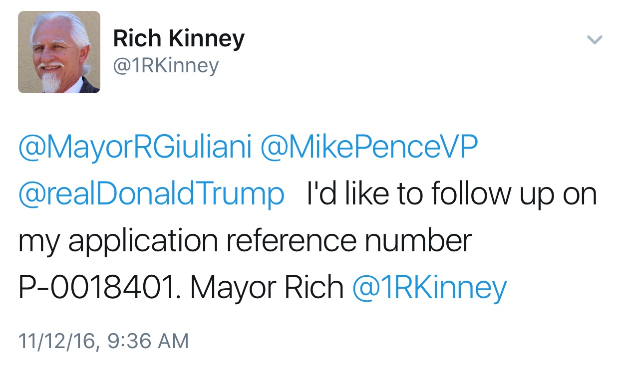 In a series of tweets last weekend, Kinney offered his services to Trump. It even appeared Kinney filled out some sort of application, according to one tweet. Kinney did not respond to an email this week asking for more information.