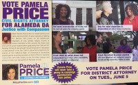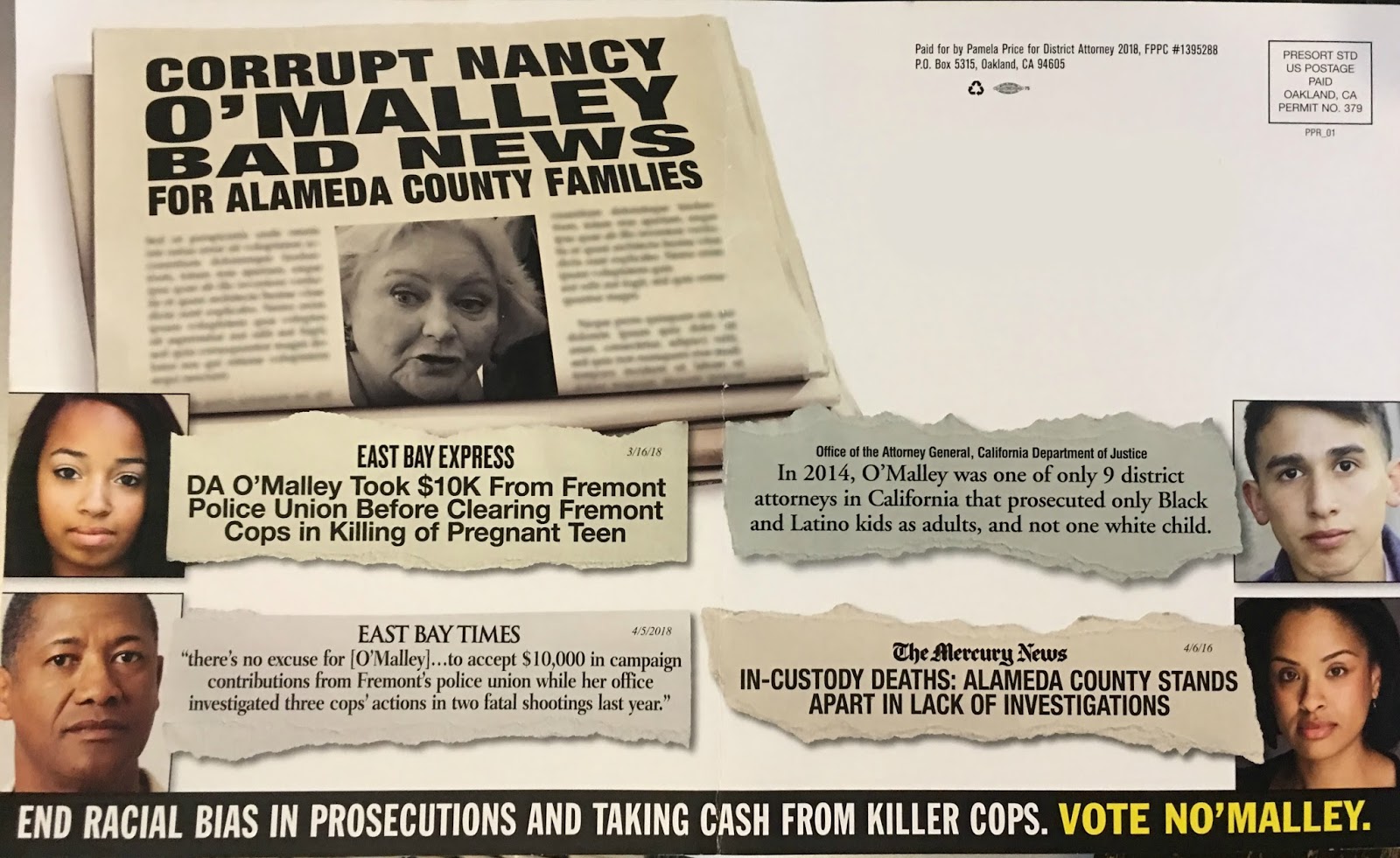 A large-size mailer sent late last week by Alameda County District Attorney candidate Pamela Price calls her opponent, incumbent Nancy O’Malley, corrupt.