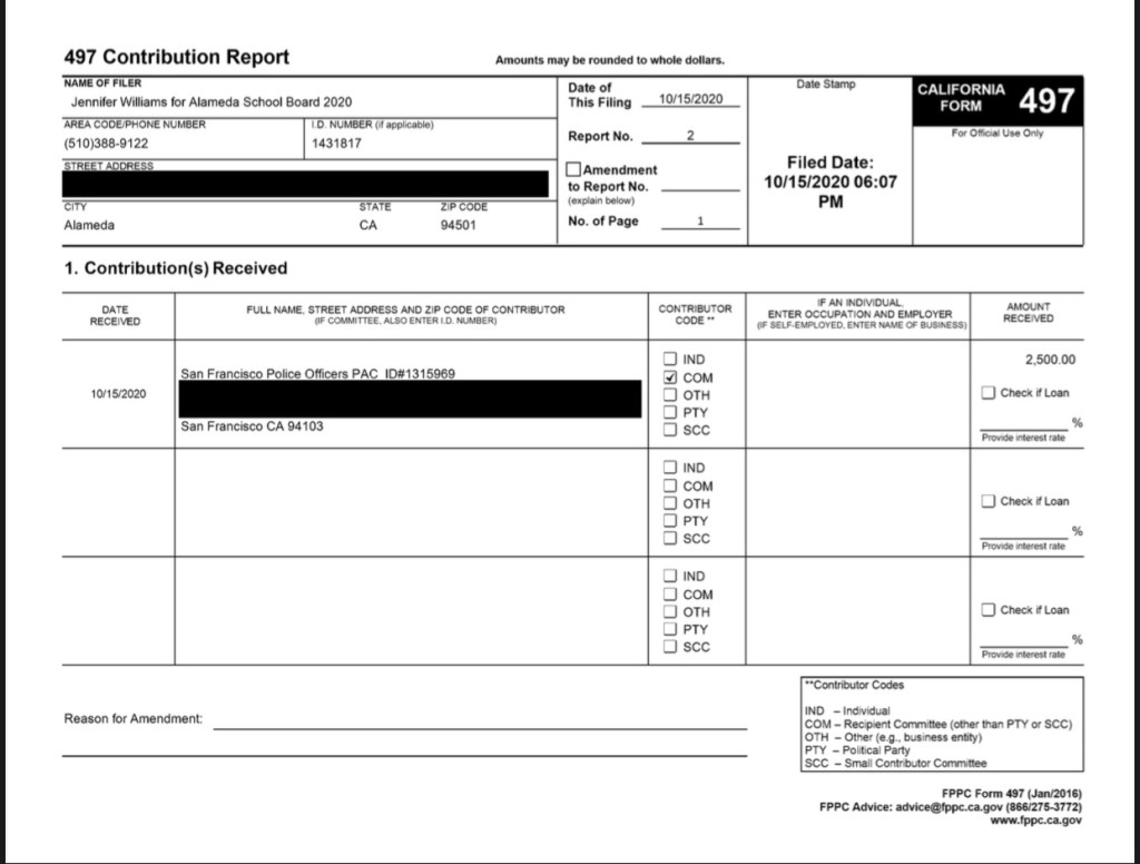 Alameda school member Jennifer Williams accepted a $2,500 campaign contribution from the San Francisco Police Officers Association this week, according to finance reports.
