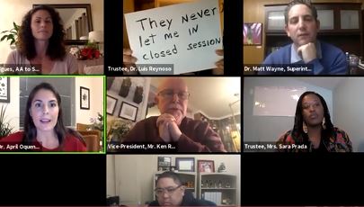 Reynoso, though, was not allowed to join the special closed session meeting. When he attempted to address the matter during a brief public comment session prior to the closed session, he was repeatedly cut off by new Board President April Oquenda. She eventually called for Reynoso’s mic to be muted.